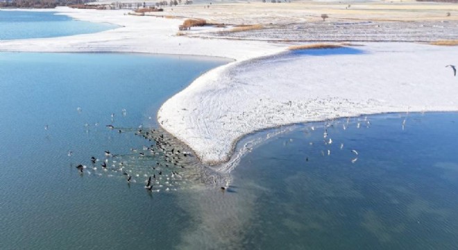 Elazığ'da etkisini sürdüren soğuk hava ve kar yağışı, Cip Baraj Gölü'nde yaban hayatına dair kartpostallık görüntüler ortaya çıkardı. Kara batakların su üzerinde ilerleyip gökyüzüne yükseldiği anlar dron ile kaydedildi.