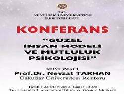 Üsküdar Üniversitesi Rektörü Prof. Dr. Nevzat Tarhan Atatürk üniversitesinde bir konferans verecek. Atatürk Üniversitesi Kültür ve Gösteri Merkezinde gerçekleştirilecek olan etkinlikte Prof. Dr. Tarhan öğrencilere Güzel İnsan Modeli ve Mutluluk Psikolojisi’ni anlatacak. Konferans sonrası Tarhan izleyicilerin sorularını cevaplandıracak.