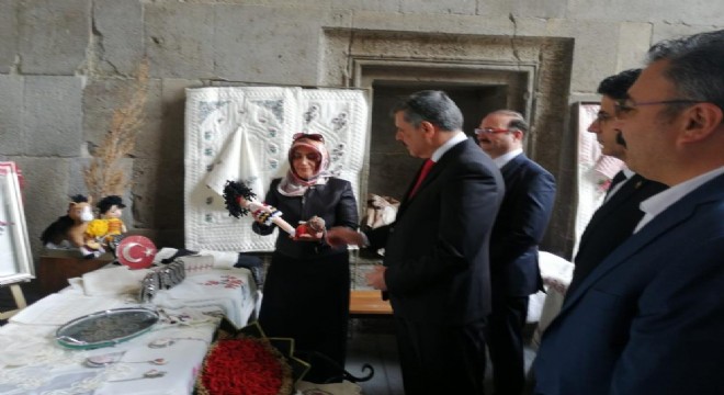 Tarihi Çifte Minareli Medrese’de el emeği göz nuru eserleri inceleyen Erzurum Valisi Mustafa Çiftçi, emeği geçenlere teşekkür etti. Pasinler Halk Eğitim Merkezi standını da gezen Vali Çiftçi, kurs hocası Sema Babagil’den bilgi aldı.