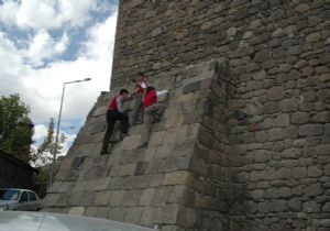 Erzurum’un en eski yapıları arasında bulunan ve binlerce turistin ziyaret ettiği Erzurum Kale’sinin duvarlarına tırmana çocuklar tehlike oluşturdu. Kale duvarlarına adeta cambaz gibi tırmanan çocuklar, tehlikenin farkında olmayarak oyun oynadılar. Üç arkadaşın birbirleriyle tırmanma yarışı yaptığını gören vatandaşlar, çocuklara uyarılarda bulundu. Yaklaşık 3 metre yüksekliğinde duvara tırmanarak çıkan çocuklar çevredekilerin yardımıyla aşağıya indirildi.