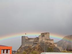 Oltu İlçesi’nde yağan yağmurun ardından çıkan yağmurda oluşan gök kuşağı Oltu kalesinin üzerinde bir hilal gibi durdu