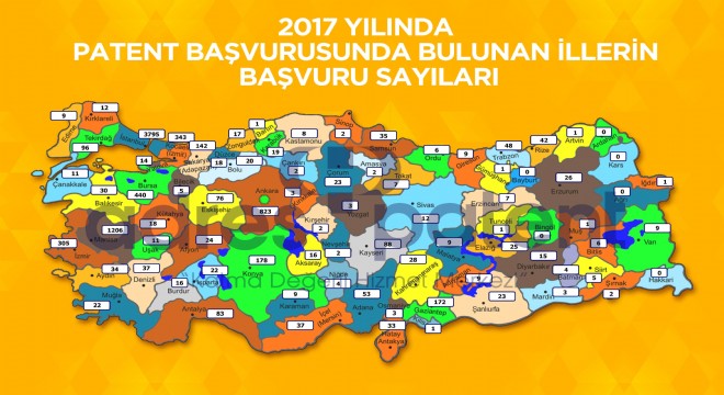 Adres Patent Genel Müdürü Cumhur Abdullah Akbulut’un paylaştığı haritadaki bilgilere göre 81 ilin 2017’deki patent başvuru sayısı şu şekilde: