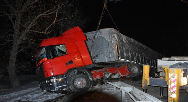Erzurum’un Aşkale İlçesi’nde meydana gelen trafik kazasında buzlanma nedeniyle yoldan çıkan TIR uçurumun kenarında durabildi.