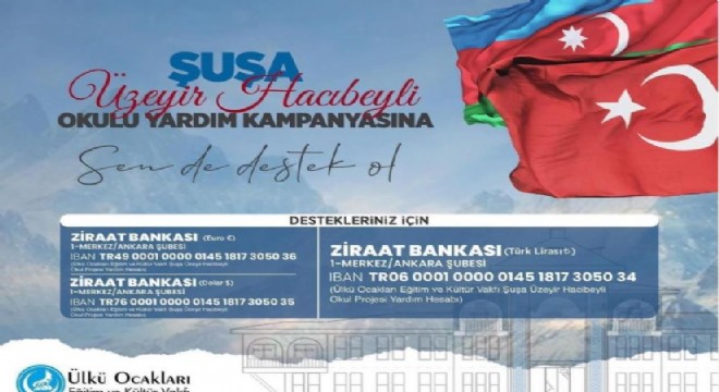 Ülkü Ocakları’ndan Şuşa’daki okul için destek kampanyası MHP Lideri Devlet Bahçeli’nin talimatları sonrası Ülkü Ocakları Eğitim ve Kültür Vakfı açıklama yaparak Şuşa’daki okul projesinin yardım kampanyasını duyurdu. Ülkü Ocakları Eğitim ve Kültür Vakfı, “Ülkü Ocakları olarak Şuşa’da dokuz derslikli Üzeyir Hacıbeyli Okulu projemiz için yardım kampanyası başlatılmıştır. Liderimiz Sayın Devlet Bahçeli Beyefendi’nin sosyal medya hesabı Twitter üzerinden 16 Ocak 2021 tarihinde Azerbaycan Şuşa’da dokuz derslikli okulun yapılabileceği müjdesini duyurması üzerine, bizatihi talimatlarıyla Ülkü Ocakları olarak harekete geçmiş bulunuyoruz. Geçtiğimiz hafta Genel Başkanımız Sayın Ahmet Yiğit Yıldırım Beyefendi ve MHP heyeti Azerbaycan yetkilileri ile görüşmeleri tamamladı. En kısa sürede yapımını bitirmeyi düşündüğümüz Üzeyir Hacıbeyli Okulunun yapım aşamasında destek olmak isteyenler için yardım kampanyası hesap numaraları aşağıda belirtilmiştir” denildi.