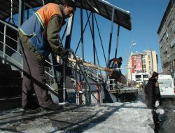 Erzurum’da cadde ve sokaklarda kar temizleme çalışmaları devam ederken buzlanmaya karşı önlemler de alınıyor. Büyükşehir Belediyesine bağlı ekipler buzlanan üst geçitlerde temizlik çalışması yaparak yayaların rahat yürümeleri için gerekli tedbirleri alıyor