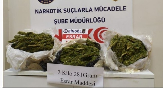 Bingöl Valiliğinden yapılan açıklamada, uyuşturucu madde ticareti yapmak ve uyuşturucu madde kullanmak suçlarına yönelik yapılan çalışmalar kapsamında şehirlerarası yolculuk yapan otobüs firmalarına yönelik uygulama gerçekleştirildiği kaydedildi. Açıklamada, 'Uygulamanın neticesinde 2 kilo 281 gram esrar maddesi ele geçirilmiştir. Konuyla ilgili olarak bir şüpheli şahsa 'Uyuşturucu madde ticareti yapmak' suçundan işlem yapılmış olup mevcutlu olarak Bingöl Cumhuriyet Savcılığı çıkarılan şahıs adli makamlarca tutuklanmıştır” denildi.