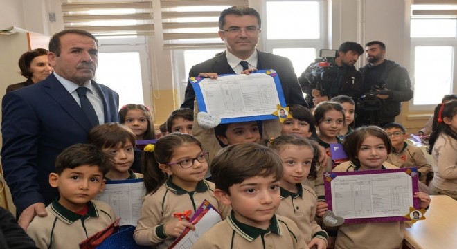 Konuşmasının ardından karne dağıtan Vali Memiş, öğrencilere elma şekeri ve kitap da hediye etti.