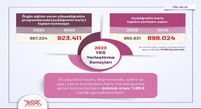 YÖK tarafından yapılan yazılı açıklamada, “Herkes için yükseköğretim ilkesiyle yola çıkarak, yükseköğretime erişimde fırsat eşitliğini temel politikamız haline getirdik. Daha önce yükseköğretim imkanlarından faydalanma fırsatı bulamamış 34 yaş üstü kadınlarımıza yönelik, devlet yükseköğretim kurumlarımızda, yaklaşık 21 bin ek kontenjan ayırdık. Bu kontenjanlar, kadınların eğitim ve kariyer olanaklarına erişimlerini artırırken, toplumsal katılımlarını güçlendirmeye de katkılar sunacaktır. Şehit ve gazi yakınlarımız için bu yıl ilk defa vakıf yükseköğretim kurumlarında 3 bin 774 kontenjan ayırdık. Böylece yükseköğretime erişimde dezavantajlı durumda bulunan adayların açılan ek kontenjanlara başvuru imkanını sağlamış olduk. Örgün eğitim veren yükseköğretim programlarında toplam kontenjan 2022 yılında 867 bin 224 iken 2023 yılında 923 bin 411 olmuştur. 2022 yılında açıköğretim hariç toplam yerleşen sayısı 850 bin 631 iken bu sayı 2023 yılında 898 bin 24 olarak gerçekleşmiştir. Bu verilere göre, toplam yerleşen sayısı geçen yıla göre 47 bin 393 kişi artmıştır. Yükseköğretim kurumlarımıza artan talebi görmekten memnuniyet duymaktayız. 2021 yılında boş kontenjanlar 169 bin iken, 2022 yılında 17 bin, 2023 yılında ise toplam 25 bin olarak gerçekleşmiştir. YKS yerleştirme sonuçlarına göre, geçen sene de olduğu gibi kontenjanlarımızın bu yıl da neredeyse tamamının dolmuş olması sevindiricidir. 34 yaş üstü kadın, depremzede, şehit ve gazi yakını kontenjanı hariç tutulduğunda genel kontenjanların doluluk oranı yüzde 99,8 olarak gerçekleşmiştir. Bu sonuç, kontenjanlar belirlenirken yapılan rasyonel planlama ve talebe yönelik yapılan analizlerin bir ürünüdür.” ifadelerine yer verildi.