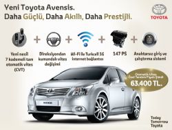 Zeka dolusu sayısız tartışma ve çalışmanın sonucunda ortaya çıkan yeni Avensis, eşsiz bir sürüş duygusu yaratan ve sürücüsünü gerçekten anlayan bir otomobil. Atletik. Asil.Yeni Avensis'in iç mekanı, içsel bir kalite duygusundan doğan, sessiz bir güven hissi veriyor. Lüks konforu, sizi büyüleyici ortamına çekerek sarmalıyor. Yeni Avensis, daha yüksek performans, daha düşük yakıt tüketimi ve daha az CO2 salımı gibi pek çok özelliği bir arada sunan Toyota Optimal Drive teknolojisiyle güçlü bir karakterin sembolü!Ayrıca yeni Avensis; yeni nesil 7 kademeli tam otomatik vitesi, direksiyondan kumandalı vites değişimi, Anahtarsız giriş ve çalışma sistemi, Wi-fi ile 3G internet bağlantısı ve 147 PS gibi birbirinden etkileyici özellikleriyle yollarda keyif sürüşünü yeni baştan yazıyor. Üstelik yeni Avensis’in otomatik vites özel tanıtım fiyatı şimdi 63.400 TL. 1.6 litre ve 1.8 litre arasındaki ÖTV farkı ise Toyota’dan! Bilgi almak için: