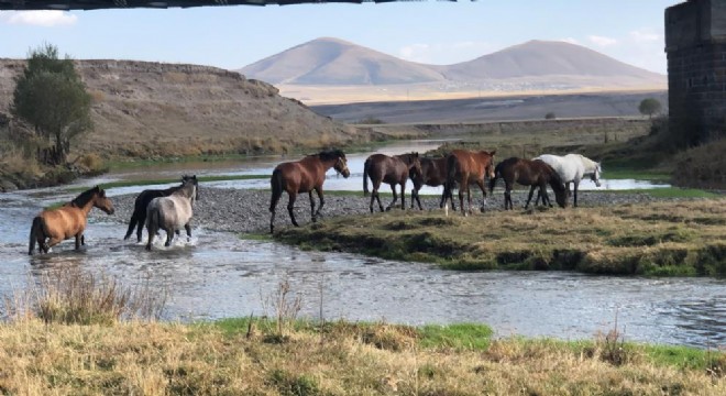 Kars Çayı’ndan su ihtiyacını da karşılayan yılkı atları daha sonra bölgeden ayrılarak gözlerden kayboldu.
