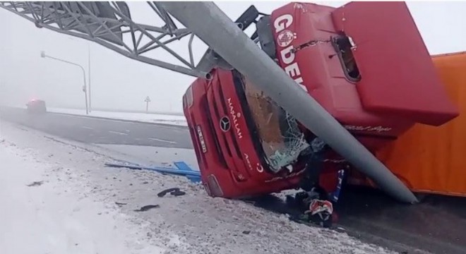 Yön levhalarına çarparak yan devrilen tır, yolun trafiğe kapanmasına neden oldu. Ardahan-Erzurum karayolunda trafik tek şeritten kontrollü olarak sağlanıyor.