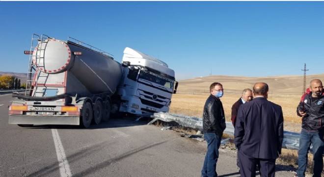 Aşkale ilçesinde meydana gelen trafik kazasında sürücüsünün direksiyon hakimiyetini kaybettiği tır, yolun ortasında karşı şeride geçerek durabildi.