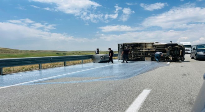 Erzurum'da süt tanklarının bulunduğu kamyonet takla attı. Yüzlerce litre süt yola döküldü.